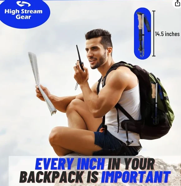 Turistické póly pro turisty se zhroutí na 37 cm (14,5 palce) a váží pouze 10 uncí, z nichž každý vám nechává místo pro své základní a osobní vybavení.