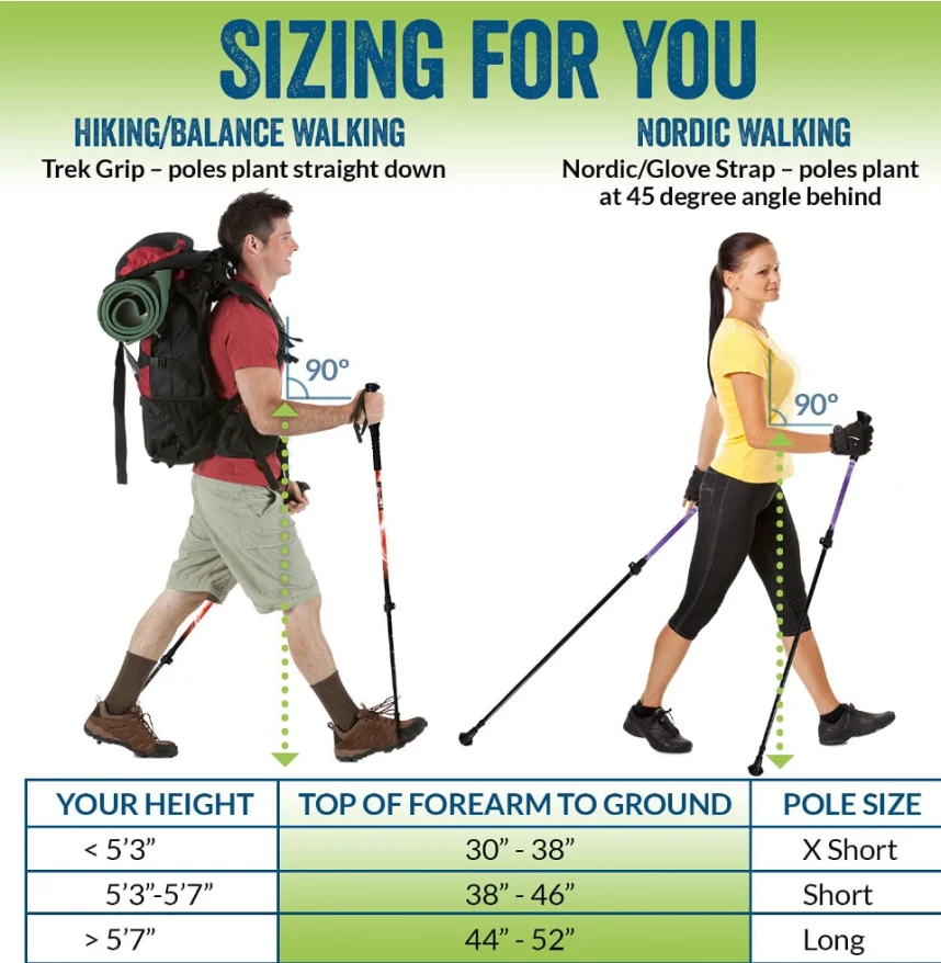 Delší velikost (pro ty 5'7 "až 6'2") rozšířené póly se upravují z 115 cm na 135 cm (45,25 "na 53"). Každý váží pouze 11 uncí. Poměry těla jsou jedinečné, proto nejpřesnější měření velikosti je od země k vrcholu předloktí, když je rovnoběžná se zemí a delší velikost je pro ty, kteří mají měření předloktí na zem 44 'až 52 ".